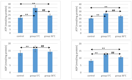 Similarly, female rats undergoing swimming training in cold water exhibited significantly higher ADP concentrations (by approximately 54%, p ≤ 0.001) compared to the control group. Female rats in the 36 °C group also showed higher ADP concentrations in their muscles (by approximately 30%, p ≤ 0.001) compared to the control group. Moreover, the ADP concentration in the muscles of female rats swimming in warm water was significantly lower (by approximately 16%, p ≤ 0.001) compared to those training in cold water (Figure 1). There were no statistically significant differences in the ADP concentration between female and male rats in groups of animals swimming in both warm and cold water.