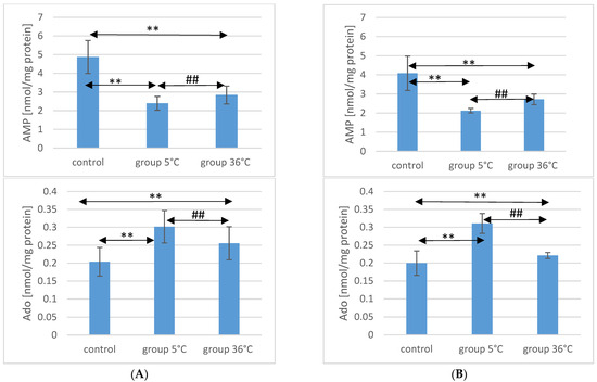 ATP, ADP, AMP, and Ado in the muscles of male (A) and female (B) rats from the control group and the experimental groups. The results are presented as means and standard deviations. ** p < 0.005 level of significance compared to the control group (Mann–Whitney U test), ## p < 0.005 level of significance compared to the 5 °C group (Mann–Whitney U test).