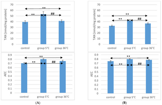TAN and AEC in the muscles of male rats (A) and female rats (B) from the control group and experimental groups. The results are presented as means and standard deviations. ** p < 0.005 level of significance compared to the control group (Mann–Whitney U test), ## p < 0.005 level of significance compared to the 5 °C group (Mann–Whitney U test).