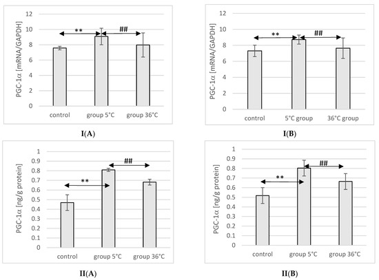 Expression of PGC-1α mRNA (I) and ELISA method protein analysis (II) in the muscles of male rats (A) and female rats (B) from the control group and experimental groups. The results are presented as means and standard deviations. ** p < 0.005 level of significance compared to the control group (Mann–Whitney U test), ## p < 0.005 level of significance compared to the 5 °C group (Mann–Whitney U test).