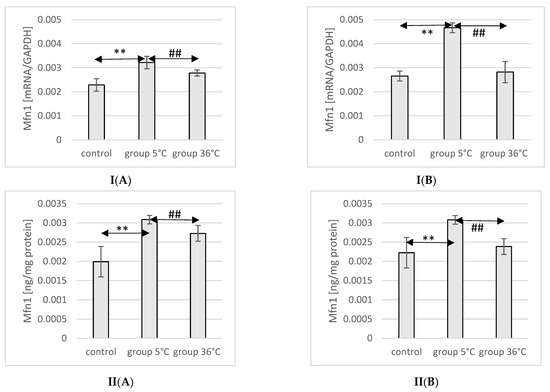 Expression of Mfn1 mRNA (I) and ELISA method protein analysis (II) in the muscles of male rats (A) and female rats (B) from the control group and experimental groups. The results are presented as means and standard deviations. ** p < 0.005 level of significance compared to the control group (Mann–Whitney U test), ## is p < 0.005 level of significance compared to the 5 °C group (Mann–Whitney U test).