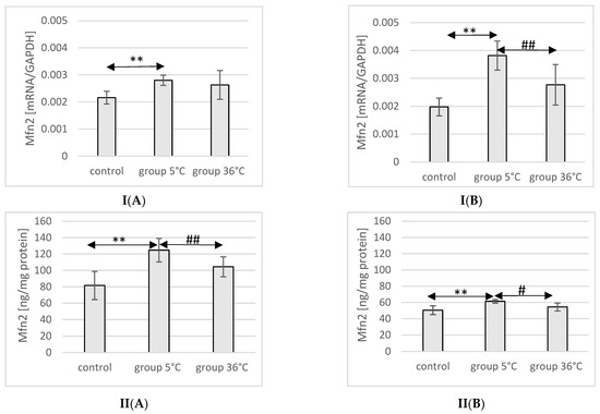 Expression of Mfn2 mRNA (I) and ELISA method protein analysis (II) in the muscles of male rats (A) and female rats (B) from the control group and experimental groups. The results are presented as means and standard deviations. ** p < 0.005 level of significance compared to the control group (Mann–Whitney U test), # is p < 0.05 level of significance compared to the 5 °C group (Mann–Whitney U test), ## is p < 0.005 level of significance compared to the 5 °C group (Mann–Whitney U test).