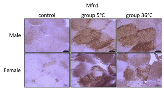 The immunoexpression of Mfn2 in the skeletal muscles of male rats swimming in cold water was slightly higher than the control group and almost comparable to its expression in the muscles of male rats swimming in warm water (Figure 7, upper panel). In female rats undergoing training in cold as well as warm water, the immuoexpression of Mfn2 was relatively in the same level, but much higher than the group (Figure 7, lower panel).