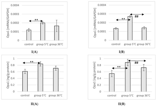 Expression of Opa1 mRNA (I) and ELISA method protein analysis (II) in the muscles of male rats (A) and female rats (B) from the control group and experimental groups. The results are presented as means and standard deviations. ** p < 0.005 level of significance compared to the control group (Mann–Whitney U test), ## is p < 0.005 level of significance compared to the 5 °C group (Mann–Whitney U test).