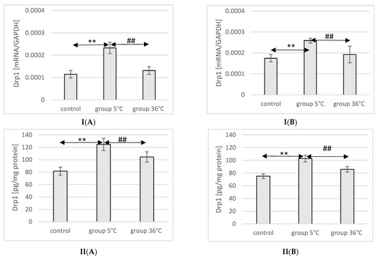 Expression of Drp1 mRNA (I) and ELISA method protein analysis (II) in the muscles of male rats (A) and female rats (B) from the control group and experimental groups. The results are presented as means and standard deviations; ** p < 0.005 level of significance compared to the control group (Mann–Whitney U test), ## is p < 0.005 level of significance compared to the 5 °C group (Mann–Whitney U test).