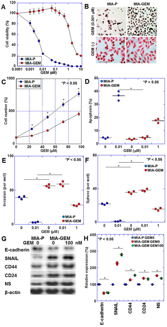 MIA-GEM cells were established by continuously treating MIA-PaCa-2 cells with low-dose GEM to induce resistance. GEM IC50 was increased to 3.5 μM, compared with 0.2 nM for the parent cell line (MIA-P cells) (Figure 1A). MIA-GEM cells were spindle-shaped compared with polygonal MIA-P cells (Figure 1B), and their proliferation rate was reduced to 62% of that of MIA-P cells (Figure 1C). Inducing apoptosis by GEM was reduced in MIA-GEM cells; however, the invasive ability of MIA-GEM cells was enhanced (Figure 1D,E). Sphere-forming ability of MIA-GEM cells was higher than that of MIA-P cells. Spheres of MIA-GEM cells showed resistance to GEM (Figure 1F). The expression of stemness markers, and E-cadherin expression decreased in MIA-GEM cells, while CD44, CD24, and nucleostemin (NS) expression increased (Figure 1G,H). Therefore, MIA-GEM cells acquired GEM resistance, enhanced stemness, and induced epithelial–mesenchymal transition.