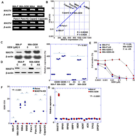 MAST4 expression in PDAC cells. (A) MAST4 expression in GEM-resistant human PDAC cells. (B) Relationship between MAST4 expression and GEM IC50. (C) MAST4 protein in GEM-treated MIA-GEM cells. (D) MAST4 knockdown by AS. Right panel, semi-quantification of (C,D). (E) GEM sensitivity in MAST4-knocked down MIA-GEM cells. (F) GEM sensitivity in MAST4-knocked down PDAC cells. (G) Expression of known GEM-resistant genes. Error bar, standard deviation from three independent trials. Statistical differences were calculated using Student’s t-test. PDAC, pancreatic ductal adenocarcinoma; MIA-P, parental MIA-PaCa-2; MIA-GEM, GEM-resistant MIA-PaCa-2; GEM, gemcitabine; MAST4, microtubule-associated serine/threonine kinase family member 4; MIAA, MIAB; GEM-resistant MIA-PaCa-2 [8]; Panc1G, GEM-resistant Panc1 [8]; Capan2G, GEM-resistant Capan2 [8]; IC50, 50% inhibition concentration; C, sense S-oligonucleotide; AS, antisense S-oligonucleotide; RPM, NB-ARC domain-containing disease resistance protein; MRP, melittin-derived peptide; MDR, multiple drug resistance; hENT, human equilibrative nucleoside transporter; dCK, deoxycytidine kinase.