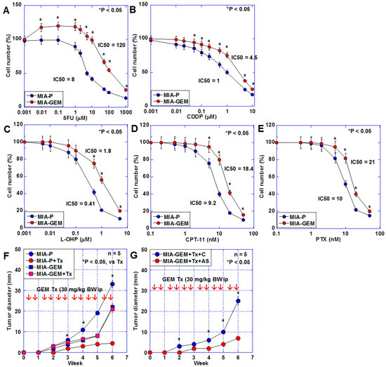 Four-week-old male Slc-nu/nu BALB/c mice (SLC Japan, Shizuoka, Japan) were maintained in accordance with institutional guidelines approved by the Committee for Animal Experimentation of Nara Medical University and the current regulations and standards established by the Ministry of Health, Labor, and Welfare (approval number 11716, 20 July 2016). MIA-P or MIA-GEM cells (1 × 107) in 100 mL HBSS (Wako) were mixed with 100 mL of Matrigel solution (#356234, Corning Inc., Corning, NY, USA) and inoculated into mouse scapular tissue subcutaneously. [51]. Cells were pretreated with 3 µM of antisense or control S-ODN (Table 5) for 3 d. Thereafter, the mice were treated with GEM (30 mg/kg body weight) intraperitoneally, twice weekly. In each treatment, 5 mice were used. Tumor sized was measured with calipers once a week.