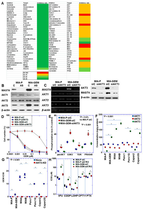 AKT3 in MIA-GEM cells. (A) Heat map of MIA-GEM cell-inhibitory effect of signal blockers. Inhibitors unrelated to AKT are shown in the left column, and AKT-related inhibitors are shown in the right column. Heatmap values indicate cell growth inhibition rate. (B) Effect of MAST4 knockdown on protein expression of AKT family. (C) Effect of AKT3 knockdown on mRNA expression (upper) and protein (lower) of MAST4 and AKT family. (D) GEM sensitivity in AKT3-knocked down MIA-GEM cells. (E) Phosphorylation levels of AKT3 signal proteins. (F) Protein levels of AKT family in GEM-resistant PDAC cells. (G) GEM sensitivity in AKT3-knocked down PDAC cells. (H) Effect of AKT3 knockdown on other anti-cancer drugs. Error bar, standard deviation from three independent trials. Statistical differences were calculated using Student’s t-test. PDAC, pancreatic ductal adenocarcinoma; MIA-P, parental MIA-PaCa-2; MIA-GEM, GEM-resistant MIA-PaCa-2; MIAA, MIAB; GEM-resistant MIA-PaCa-2 [8]; Panc1G, GEM-resistant Panc1 [8]; Capan2G, GEM-resistant Capan2 [8]; GEM, gemcitabine; MAST4, microtubule-associated serine/threonine kinase family member 4; C, sense S-oligonucleotide; AS, antisense S-oligonucleotide; siC, control short interfering RNA; siAKT3, short interfering RNA to AKT3; GSK3β, glycogen synthase kinase 3β; TOR, target of rapamycin; PRAS40, proline-rich AKT substrate of 40-kDa; 5FU, 5-fluorouracil; CDDP, cisplatin; L-OHP, oxaliplatin; CPT-11, irinotecan; PTX, paclitaxel.