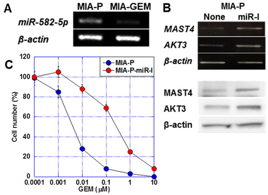 miR-582-5p is a microRNA that regulates AKT3 expression [23,24]. We observed a 6.0-fold increase in miR-582-5p expression in MIA-P cells compared with that in A-GEM cells (Figure 5A). The treatment of MIA-P cells with miR-582-5p inhibitor induced MAST4 and AKT3 expression at the mRNA and protein levels (Figure 5B). Furthermore, the treatment of MIA-P cells with miR-582-5p reduced the GEM sensitivity of MIA-P cells to a level comparable to that of MIA-GEM cells (Figure 5C).