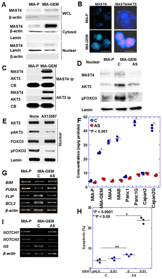 GEM-resistant MIA-GEM cells had enhanced stemness and anti-apoptotic survival, which also provide resistance to 5FU and CDDP. MAST4 expression was higher in MIA-GEM cells than in MIA-P cells. MAST4 translocated into the nucleus, bound to AKT3 in the nucleus, inactivated the AKT3 downstream signal, FOXO3, suppressed apoptosis, and promoted stemness with proliferation.