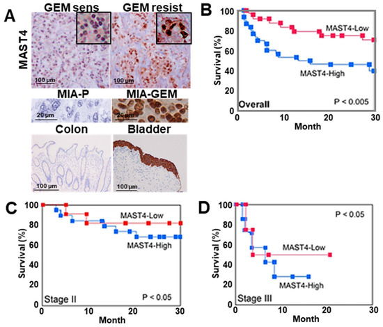 MAST4 expression in human PDAC cases. (A) Immunohistochemical detection of MAST4 in the nuclei of PDAC cases. Insets show high magnification. Middle panels, MAST4 immunohistochemistry images in mouse tumors of MIA-P (negative control) and MIA-GEM (positive control). Lower panels, MAST4 immunohistochemistry images in colon mucosa (negative control) and bladder urothelium (positive control). (B–D) Survivals between MAST4-high and -low cases; overall (B), stage II (C), and stage III (D). The MAST4-high and MAST4-low groups were divided based on the median MAST4 expression. Survival curves were calculated using the Kaplan–Meier method. Statistical differences were calculated using the log-rank test. PDAC, pancreatic ductal adenocarcinoma; MIA-P, parental MIA-PaCa-2; MIA-GEM, GEM-resistant MIA-PaCa-2; GEM, gemcitabine; MAST4, microtubule-associated serine/threonine kinase family member 4.