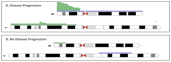 Partial ideogram summarizing the chromosomal abnormalities detected by array-CGH + SNP analysis. Green lines indicate regions of CN-LOH, and blue lines indicate gain. 9p and 1p CN-LOH were more frequent in ET/prePMF patients with disease progression (panel (A)) compared to patients without disease progression (panel (B)). We also performed a multivariable Cox regression analysis, and an abnormal array retained its significance associated with PFS (p = 0.018, HR = 2.89, 95% CI: 1.2, 6.97). In addition, abnormal cytogenetics retained its association with worsening progression-free survival (p = 0.010, HR = 2.35 95% CI: 1.23–4.51). There was no association with age, gender, or HMR mutations.