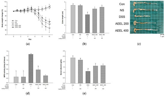 To evaluate DSS-induced colitis symptoms in mice, the bodyweight change rate, colon length, myeloperoxidase (MPO) activity, and serum albumin contents were investigated (Figure 2). In terms of measuring the bodyweight change rate, there were no significant differences between the control (Con) group (105.00%) and the normal sample (NS) group (104.09%) (Figure 2a). However, the body weight of the DSS group’s (81.99%) significantly decreased compared to the Con group. Conversely, the body weight of the AEEL 200 group (86.13%) and the AEEL 400 group (88.62%) significantly increased compared to the DSS group.