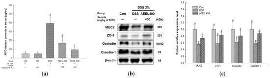 To evaluate intestinal permeability in DSS-induced mice, the fluorescein isothiocyanate (FITC)-dextran contents in serum and protein expression levels related to TJ, such as mucin 2 (MUC2), zonula occludens-1 (ZO-1), occludin, and claudin-1 in mouse colon tissues, were investigated (Figure 3). In terms of measuring FITC-dextran contents, there were no significant differences between the Con group (49.25 μg/mL) and the NS group (48.57 μg/mL) (Figure 3a). However, the DSS group (393.29 μg/mL) significantly decreased compared to the Con group. Conversely, the AEEL 200 group (170.72 μg/mL) and the AEEL 400 group (94.53 μg/mL) significantly increased compared to the DSS group.