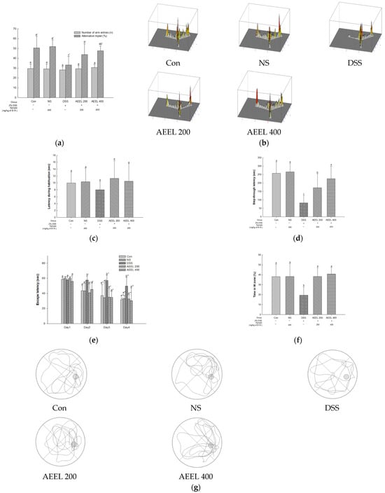 To evaluate cognitive function in DSS-induced mice, the Y-maze test, passive avoidance test, and Morris water maze test were conducted (Figure 4). Spontaneous alteration behavior was evaluated using the Y-maze test, and it was confirmed that there was no significant difference in the motility of the mice in all groups, as measured through the number of entries into each arm of the Y-shaped maze (Figure 4a). Additionally, there was no significant difference in alternative behavior between the Con group (50.67%) and the NS group (51.96%) (Figure 4a,b). However, the DSS group’s (33.16%) alternative behavior significantly decreased compared to that of the Con group. Conversely, the alternative behaviors of the AEEL 200 group (43.87%) and the AEEL 400 group (47.72%) were significantly increased compared to that of the DSS group.