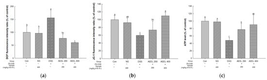 Upon measuring mitochondrial ATP levels, there was no significant difference between the Con group (100%) and the NS group (98.26% of the control) (Figure 5c). However, the DSS group level (48.41% of the control) was significantly decreased compared to the Con group. Conversely, the AEEL 200 group (63.86% of control) and the AEEL 400 group (90.55% of control) levels were significantly increased compared to the Con group.