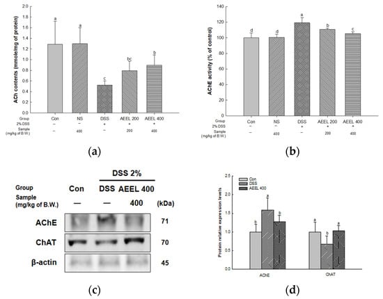 Alleviative effect of AEEL on DSS-induced cholinergic dysfunction. Acetylcholine (ACh) contents (a), acetylcholinesterase (AChE) (b), band images of Western blot analysis (c), and the expression level of cholinergic system signaling (d) in brain tissues. The results shown are mean ± SD (ACh contents and AChE activity, n = 6; Western blot, n = 4). The level of statistical significance of the data is p < 0.05, with different small letters indicating statistical differences between all groups.