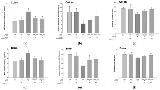 Upon measuring the SOD levels in colon and brain tissues, there was no significant difference between the Con group (colon, 11.32 U/mg of protein; brain, 9.92 U/mg of protein) and the NS group (colon, 11.14 U/mg of protein; brain, 9.82 U/mg of protein) (Figure 7c,f). However, the DSS group levels (colon, 8.81 U/mg of protein; brain, 8.28 U/mg of protein) were significantly decreased compared to the Con group. Conversely, the levels of the AEEL 200 group (colon, 10.28 U/mg of protein; brain, 8.99 U/mg of protein) and the AEEL 400 group (colon, 10.89 U/mg of protein; brain, 9.50 U/mg of protein) were significantly increased compared to the DSS group.