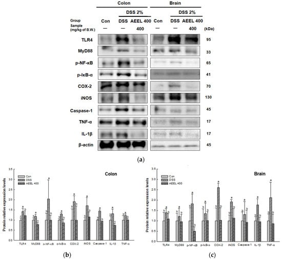 To evaluate the alleviative effect of AEEL in DSS-induced inflammation, the protein expression levels related to inflammation, such as toll-like receptor 4 (TLR4), myeloid differentiation primary response protein 88 (MyD88), the phosphor-nuclear factor κ-light-chain-enhancer of activated B cells (p-NF-κB), p-IκB-α, cyclooxygenase 2 (COX-2), inducible nitric oxide synthase (iNOS), cystein-aspartic acid protease 1 (caspase-1), interleukin-1β (IL-1β), and tumor necrosis factor α (TNF-α) in colon and brain tissues were investigated (Figure 8). The protein expression levels of TLR4 (colon, 1.41; brain, 1.38), MyD88 (colon, 1.17; brain, 1.21), p-NF-κB (colon, 2.03; brain, 1.81), p-IκB-α (colon, 1.30; brain, 1.34), COX-2 (colon, 1.90; brain, 2.60), iNOS (colon, 1.70; brain, 1.91), caspase-1 (colon, 1.43; brain, 1.30), IL-1β (colon, 1.31; brain, 1.76), and TNF-α (colon, 1.21; brain, 2.11) of the DSS group in colon and brain tissues were upregulated compared to the Con group (colon, 1.00; brain, 1.00). However, the AEEL 400 group levels (colon, 1.21, 0.78, 0.99, 0.85, 0.99, 1.15, 0.95, 0.74, and 1.00, respectively; brain, 1.09, 0.95, 0.49, 1.00, 1.02, 1.13, 0.92, 0.95, and 0.85, respectively) were downregulated compared to the DSS group.