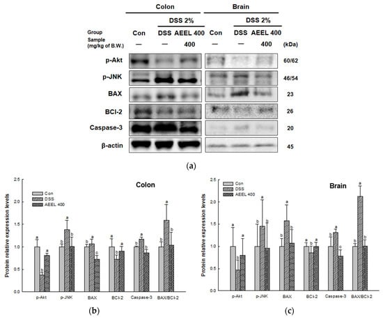 To evaluate the alleviative effect of AEEL in DSS-induced apoptosis, the protein expression levels related to apoptosis, such as those of phosphoprotein kinase B (p-Akt), phospho c-Jun-N-terminal kinase (p-JNK), BCl-2-associated X protein (BAX), B-cell lymphoma 2 (BCl-2), caspase-3, and the BAX/BCl-2 ratio were investigated (Figure 9). The protein expression levels of p-Akt (colon, 0.37; brain, 0.46) and BCl-2 (colon, 0.72; brain, 0.85) of the DSS group were downregulated compared to the Con group (colon, 1.00; brain, 1.00). However, the AEEL 400 group levels (colon, 0.81 and 0.90, respectively; brain, 0.80 and 1.00, respectively) were significantly upregulated compared to the DSS group. The protein expression levels of p-JNK (colon, 1.38; brain, 1.45), BAX (colon, 1.07; brain, 1.57), caspase-3 (colon, 1.17; brain, 1.31), and BAX/BCl-2 ratio (colon, 1.58; brain, 2.11) of the DSS group were upregulated compared to the Con group (colon, 1.00; brain, 1.00). However, the AEEL 400 group levels (colon, 1.00, 0.72, 0.87, and 1.04, respectively; brain, 0.95, 1.07, 0.77, and 1.00, respectively) were significantly downregulated compared to the DSS group.