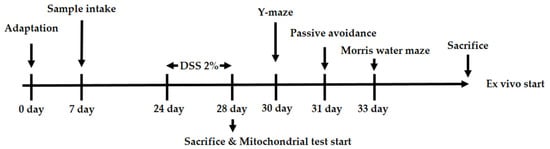 - Lee, H.L.; Kim, J.M.; Moon, J.H.; Kim, M.J.; Jeong, H.R.; Go, M.J.; Heo, H.J. Anti-Amnesic Effect of Synbiotic Supplementation Containing Corni fructus and Limosilactobacillus reuteri in DSS-Induced Colitis Mice. Int. J. Mol. Sci. 2022, 24, 90. [Google Scholar] [CrossRef] [PubMed]