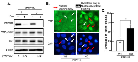 Loss of PTPN12 reduces phosphorylation of YAP at S127 and increases YAP nuclear localization. (A) Western blot analysis. Reduced phosphorylation of YAP at S127 by PTPN12 in MCF10A-iCas9-gPTPN12-KO mammary cells. MCF10A-iCas9 cells stably expressing gPTPN12-2 (1) or gPTPN12-3 (2) were left untreated (−) or treated (+) with Dox for 5 days, followed by Western blot analysis of PTPN12, YAP, and S127-phosphorylated YAP (YAP-pS127) using anti-PTPN12, anti-YAP, and anti-pS127-YAP antibodies. Band intensity of YAP and pYAP was quantified using ImageJ. Relative intensity of phosphorylated YAP (pYAP) and YAP (pYAP/YAP ratio) is shown. (B,C) Immunostaining analysis of YAP subcellular localization. YAP immunostaining in MCF10A cells with wild-type (WT) or knockout (KO) PTPN12. DAPI was used to stain nucleus. For each cell line, approximately 100 cells were counted for YAP nuclear-only (red arrow in (B)) or cytoplasmic/cytoplasmic + nuclear (white arrow in (B)) staining cells. Scale bar, 200 μm. Quantitative analysis of YAP staining showed that in more than 50% of MCF10A-PTPN12-KO cell lines, YAP was localized in nucleus, whereas less than 25% of WT cell lines demonstrated YAP nuclear localization (C). *, p ≤ 0.05 (statistical significance).