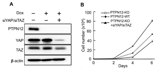 PTPN12 regulates cell proliferation, which is mediated by the Hippo signaling pathway. (A) Western blot analysis of YAP and TAZ after the siYAP/siTAZ transfection of short interference RNAs targeting YAP/TAZ (siYAP/siTAZ) into MCF10A-gPTPN12 cells. (B) Cell proliferation assay. Cell proliferation was measured in MCF10A-PTPN12-WT (−Dox, −siYAP/siTAZ), MCF10A-PTPN12-KO (+Dox, −siYAP/siTAZ), and MCF10A-PTPN12-KO-siYAP/siTAZ (+Dox, +siYAP/siTAZ) cells. Cell numbers were counted on days 2, 4, and 6 after seeding.