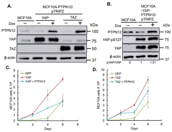 To establish inducible PTPN12 in MCF10A or NMuMG cells overexpressing wild-type YAP or TAZ, previously established YAP/TAZ overexpressing cells [15,70] were infected with lentivirus expressing PTPN12 cloned in a Dox-inducible vector pTRIPZ, followed by puromycin selection at 1.5 µg/mL.