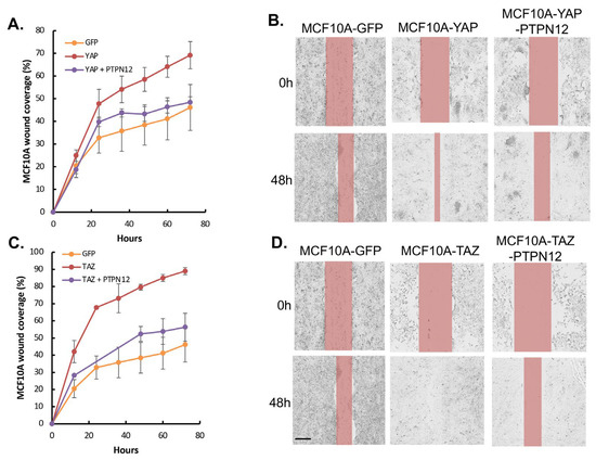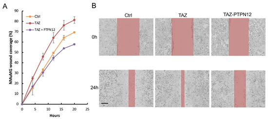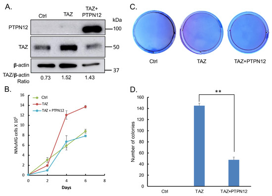 In addition, the overexpression of PTPN12 (Figure 10A) inhibits TAZ-induced increased cell proliferation (Figure 10B) and anchorage-independent growth on soft agar (Figure 10C,D), as well as promoting cell migration (Figure 11A,B) in NMuMG mouse mammary cells.