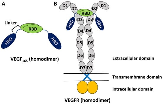 (A) Schematic representation of VEGF165 as a homodimer with two monomers. Each monomer is composed of RBD and HBD, connected by a flexible linker. (B) VEGF165 binding with VEGFR toward its activation. VEGFR is also a homodimer and is composed of an extracellular domain with seven sub-domains in each monomer, a transmembrane domain lying in lipid, and an intracellular domain extruding into the cytoplasm.