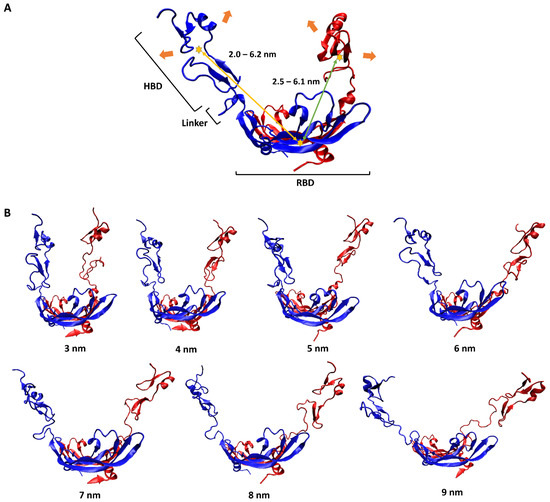 To have a pictorial sense of the large-scale motion, the lowest-frequency normal mode of VEGF165 was first predicted using ANM analysis on VEGF165. As mentioned above, this approach was selected because observing large-scale motions induced by flexible linkers solely through unbiased MD simulations is highly challenging due to the sampling difficulty. This motion could be characterized as a scissoring bending vibration between the two HBD units, with oscillations in the distance between the two (Figure 2A). To reflect this large-scale motion, we generated seven different VEGF165 conformations by using biased MD simulations, increasing the distance between the centers of mass (COMs) of the two HBD units from 3 nm to 9 nm in 1 nm intervals (Figure 2B). In addition, from each 10 ns long biased MD trajectory, VEGF165 snapshots were extracted at every 500 ps to account for small-scale motions of the protein. Accordingly, 20 VEGF165 structures were extracted from each biased MD simulation, resulting in a total of 140 (7 × 20) VEGF165 conformations. With these, we calculated all possible intra-monomer COM distances between RBD and HBD as well as the inter-monomer ones, and the distances ranged 2.0–6.2 nm and 2.5–6.1nm, respectively (Figure 2A).