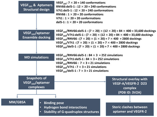 The initially designed structures of the DNA aptamers and VEGF165, along with the structures utilized in MD simulations, docking, MM/GBSA calculations, and associated files, i.e., input, parameters, topology files, and scripts for data analyses, are accessible to the public on GitHub (https://github.com/GoYeonju/Ensemble-docking (accessed on 24 November 2023)). The MD simulations, analyses, and MM/GBSA calculations were performed using GROMACS 2022 and AmberTools22, and all docking procedures were performed using HDOCK.