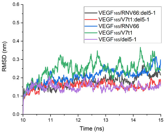 To obtain binding free energies using MM/GBSA, we first performed 15 ns MD simulations for each complex with the chosen structures. After analyzing the time course of the root-mean-square deviation (RMSD) for each complex from its 15 ns MD trajectory, we confirmed that all 567 structures were equilibrated within 10 ns. The time course of the RMSD for each complex was calculated with respect to its initial structure. However, upon observing the complex structures after the 15 ns period, we found that some complexes did not meet the attachment criteria mentioned above. Thus, these trajectories were excluded from the list, and there remained 491 trajectories in total for further analyses, as follows: 218 for VEGF165/RNV66:del5-1; 210 for VEGF165/V7t1:del5-1; 21 for VEGF165/RNV66; 21 for VEGF165/V7t1; and 21 for VEGF165/del5-1. For each MD trajectory, using the snapshots sampled at every 10 ps over its last 5 ns, we calculated the binding free energy using the single-trajectory approach of MM/GBSA [32]. The time courses of the RMSD values obtained from the MD trajectories with the lowest binding free energies for the five types of VEGF165/aptamer complexes are shown in Figure 5. In this case, the RMSD values were calculated using the complex structure at the 10 ns mark of each MD trajectory as the reference structure.