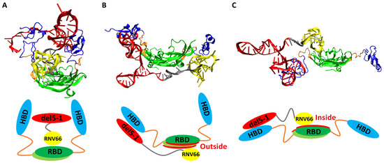 Typical poses of VEGF165/aptamer complexes: (A) a sandwich pose of VEGF165/RNV66:del5-1, (B) a side pose of VEGF165/RNV66:del5-1, and (C) a hug pose of VEGF165/RNV66:del5-1. The structures obtained through VMD for each pose are presented alongside their schematic representations. The representative structures for each pose were arbitrarily chosen. For aptamers, RNV66 and V7t1 are shown in yellow, while del5-1 is in red, with the linker in silver. For VEGF165, RBD is in green, while HBD is in blue, with the linker in orange.