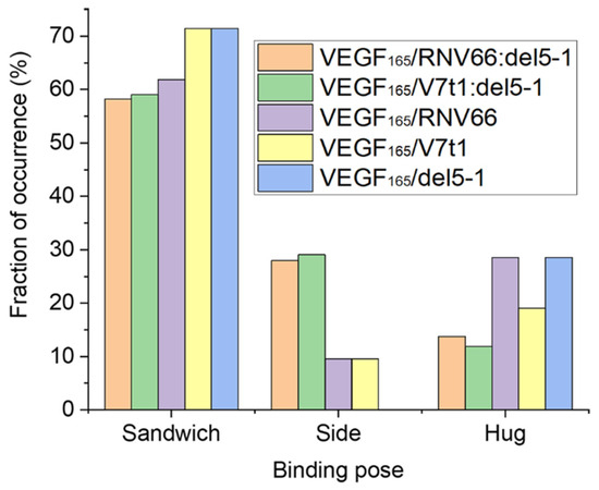 Upon computing the fraction of occurrences of these three binding poses, we observed that all the five aptamers we adopted preferred the sandwich pose when binding to VEGF165 (Figure 7). This indicates that the sandwich pose is the most stable structure for complexation. Interestingly, aptamer heterodimers displayed fewer sandwich and hug poses compared to monomeric aptamers. The binding poses of the top-ten complex structures for each type of VEGF165/aptamer complex can be found in Table S4.