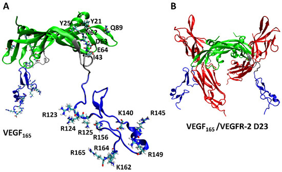 (A) Key residues of VEGF165 in binding with VEGFR-2 and heparin, with the RBD/HBD/linker unit depicted in green/blue/silver. (B) Schematic representation of the complex formed by VEGF165 together with VEGFR-2 D23. VEGFR-2 D23 is highlighted in red.