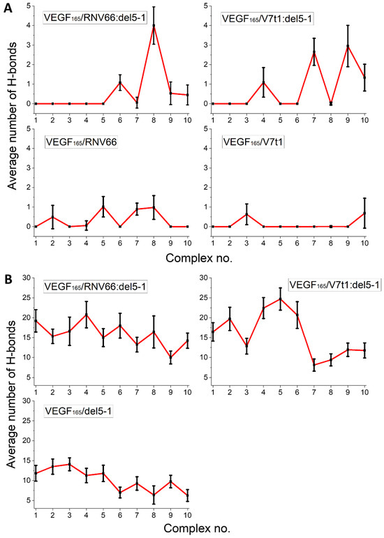Average number of H-bonds formed between the aptamers and the key residues of VEGF165 in (A) the RBD and (B) the HBD parts. Horizontal axes denote the top-ten complex structures for the given complex type.