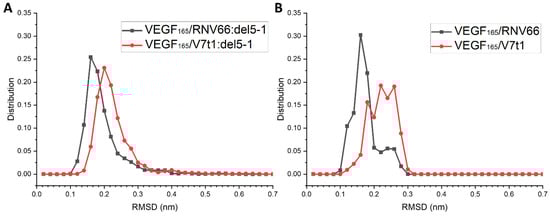 RNV66 and V7t1 are known to possess G-quadruplex structures [24]. We attempted to see whether the G-quadruplex structures of RNV66 and V7t1 were maintained during their binding to VEGF165, either as a monomeric aptamer or as part of a heterodimer. We adopted the trajectories of the VEGF165/aptamer complexes containing either RNV66 or V7t1, for a total of 470 trajectories each 15 ns long, as explained in Section 2.3. In the case of RNV66, to assess the stability of a G-quadruplex structure, we calculated the RMSD using the twelve residues that constitute the G-quadruplex region with respect to its NMR structure (PDB ID: 2M53) [24]. For V7t1, we adopted the corresponding twelve residues for the RMSD calculation, and the reference was the energy-minimized structure of V7t1, namely the energy minimization result that started from the NMR structure of RNV66 after replacing LNA-G residues with DNA-G residues. The results are shown in Figure 11, in which it can be observed that the binding of RNV66 and V7t1 to VEGF165 either as a monomeric aptamer or as part of a heterodimer did not significantly alter their G-quadruplex structures. Interestingly, RNV66 preserved the G-quadruplex structure better than V7t1, and the extent of the preservation was larger in the monomer case (Figure 11B). This aspect is consistent with the fact that the LNA modifications in RNV66 enhance the stability of the G-quadruplex structure [24,54] and further supports our prediction that RNV66:del5-1 will likely work better than V7t1:del5-1.