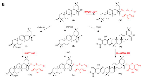 H. helix is considered an excellent source of triterpenoid saponins and flavonoids [23]. Therefore, this study tested the substrate and product specificity of HhUGT74AG11 through various oleanane-type triterpenoids and flavonoids (Figure 4 and Figure S2–S9). Interestingly, HhUGT74AG11 can catalyze various triterpenoid glycosides and triterpenoid saponins and presents significant activity toward a specific type of flavonoid. Members of the UGT74 subfamily are generally found in reports on triterpenoid saponin biosynthesis, such as Saponaria vaccaria SvUGT74M1 [24], Siraitia grosvenorii UGT74AC1 [25], and Nigella sativa NsUGT74Q1 [26]. Some studies have published UGT74 subfamily members involved in flavonoid glycoside biosynthesis, such as Oryza sativa OsUGT74 [27]. It is worth discussing that the strong hybridity of the UGT74 subfamily may be because ancestral enzymes on glycosylation functional branches help plants adapt to complex and changing chemical environments through the evolution and functional differentiation of gene families.