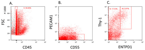 Dot plot analysis revealed the presence of CD55+Thy-1+ cells within the CD45−–PECAM1− gate (Figure 1A,B). The CD55+Thy-1+ fraction exhibited a diverse population, including varying proportions of ENTPD1+ and ENTPD1− cells (Figure 1C).