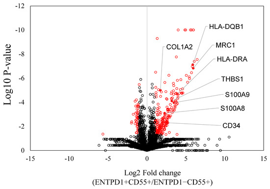 Differently expressed proteins between ENTPD1−CD55+ and ENTPD1+CD55+ cells. A volcano plot was utilized to illustrate the differentially expressed proteins between ENTPD1−CD55+ and ENTPD1+CD55+ cells. Statistically significant values (p < 0.05) are denoted by red circles, while non-significant values are indicated by black spots. Red dots indicate fibrocyte-related markers.