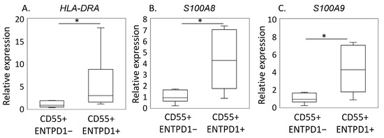 Gene expression of fibrocyte-related genes in ENTPD1−CD55+ and ENTPD1+CD55+ cells. (A) HLA-DRA, (B) S100A8, (C) S100A. (n = 5) Statistically significant values (p < 0.05) are indicated by *.