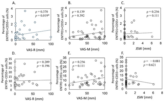 Table 4 presents patient demographic and clinical features, and Figure 4A–F display scatterplots illustrating these correlations. In knee OA patients, a significant correlation was observed between the proportion of ENTPD1+CD55+ cells in the synovium and the visual analogue scale at rest (VAS-R) (ρ = 0.370, p = 0.019, Figure 4A). However, no correlation was found between VAS with movement (VAS-M) levels, joint space width (JSW), and the proportion of ENTPD1+CD55+ cells (VAS-M, ρ = 0.139, p = 0.392; JSW, ρ = 0.256, p = 0.111, Figure 4B,C).