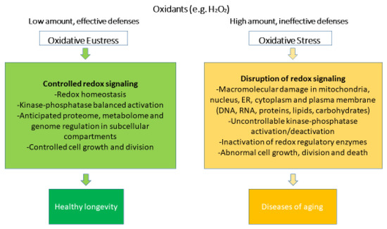 Oxidative eustress occurs after physical exercise [41] in response to small stressors, such as mild pharmacological interventions [42], and it is usually considered a physiological and endogenous process [43,44], also known as “mitohormesis” [44]. In oxidative eustress, low (nanomolar for H2O2) concentrations of oxidants interacting with their specific targets maintain the physiological signaling [45].