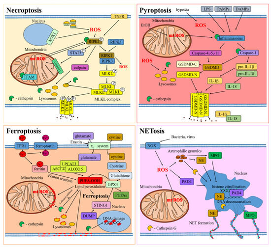The interplay between ROS and cathepsins was also highlighted in other forms of regulated cell death, including necroptosis, ferroptosis, pyroptosis, and NETosis.