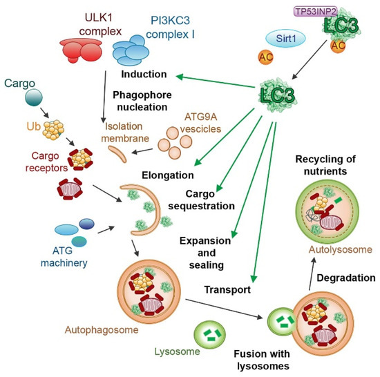 The role of LC3 proteins in selective autophagy. The figure illustrates the involvement of the LC3 subfamily of ATG8 proteins in different steps of selective autophagy. Reproduced with permission from [172].