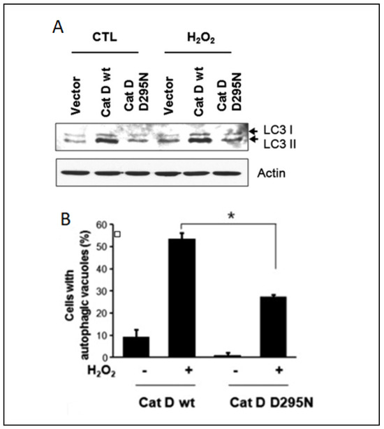 Correlation between cathepsin D expression and autophagy in HeLa cells: (A) Western blotting analysis of HeLa cells expressing wildtype cathepsin D and cathepsin D D295N after treatment with 1 mM of H2O2 for 24 h. (B) Percentage of HeLa cells with autophagy vacuoles after H2O2 treatment. Data were obtained from confocal images of cells transfected with GFP-LC3 plasmid. +/− means HeLa cells with or without H2O2 treatment, * indicates the significance. Reproduced with permission from [188].