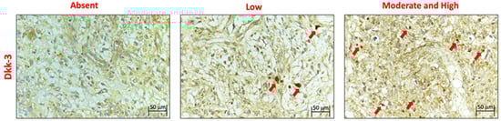 Figure 1. Immunohistochemical expression of DKK3 (red arrows indicate positive neoplastic endothelial cells).