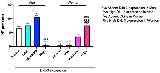 Figure 3. The correlation between DKK3 expression and sex. Two-Way ANOVA followed by Bonferroni post hoc test for multiple comparisons; * p < 0.05 and *** p < 0.001 vs. absent DKK3 expression in men; °°° p < 0.001 vs. high DKK3 expression in men; ### p < 0.001 vs. absent DKK3 expression in women; §§§ p < 0.001 vs. high DKK3 expression in women. Data refer to mean values of N = 3 independent experiments ± SEM.
